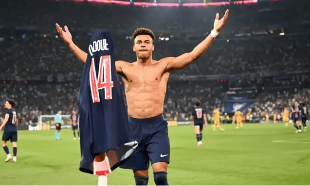 本赛季,杜埃已成为巴黎阵中不可或缺的核心。各项赛事 13 球 13 助攻的两双数据,不仅助球队拿下法甲与法国杯,更在欧冠赛场屡次扮演 “关键先生”。决赛中,他先是接姆巴佩助攻推射首开纪录,随后轰出世界波扩大比分,终场前又为队友送上助攻,用统治级表现点燃全场。