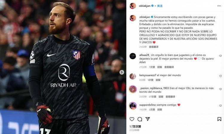直播吧3月13日讯 马竞在本轮欧冠主场被皇马点球淘汰,门将奥布拉克在不久前通过社媒发文。